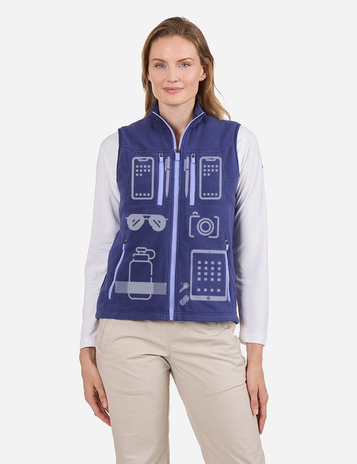 The intersection of fashion and function, the Fleece Crest Vest for Women offers the utility of 15 perfectly placed pockets in a chic garment with stylish pops of color on the zippers. The richly colored fleece is soft, comfortable and warm. Thanks to the versatile design, you'll feel equally at home on the trails or running errands in town. Five exterior and 10 interior pockets offer easy access to your essentials, while keeping your valuables safe and secure. Enjoy clever SCOTTeVEST features, like the attached chamois to keep both glasses and screens clean. Check out the Men's version with complementary rather than matchy-matchy color combos.